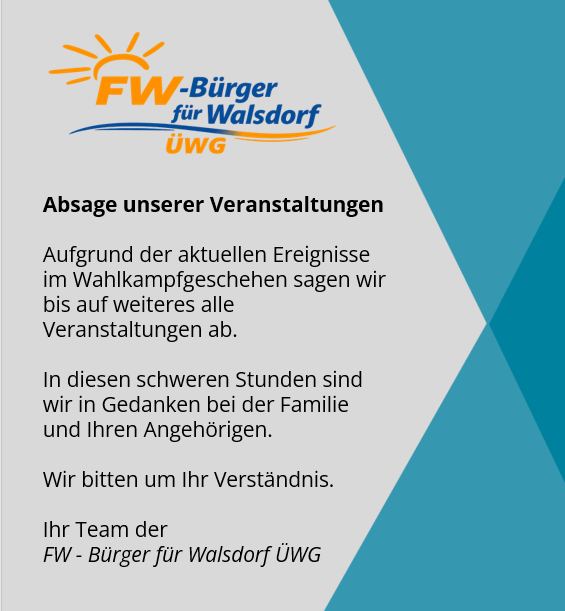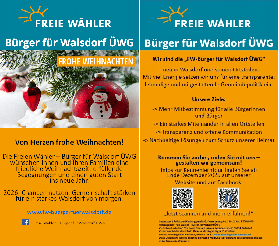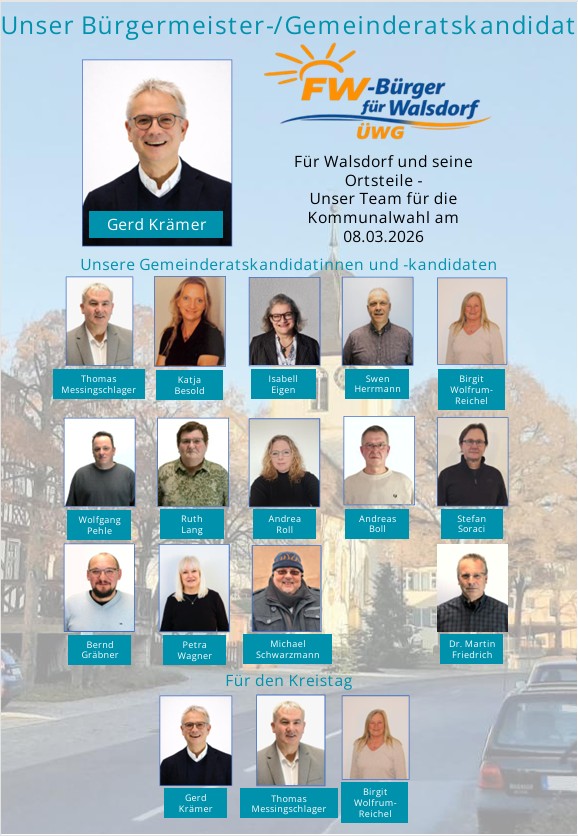 Die Bürger für Walsdorf ÜWG wurde am 29.10.2025 in Walsdorf gegründet. Zur Kommunalwahl im März 2026 wollen wir zum ersten mal eine Liste für die Gemeinderatswahl in Walsdorf aufstellen .