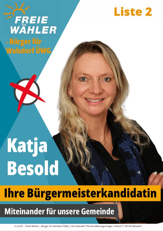 Walsdorf – Die Freien Wähler – Bürger für Walsdorf ÜWG, haben einen neuen Kandidaten für die Bürgermeisterwahl. Nachdem Gerd Krämer, 1. Vorsitzender der FW/ÜWG, Bürgermeister-, Gemeinderats- und Kreistagskandidat bei der 1. Wahlversammlung der FW/ÜWG zusammengebrochen und kurz darauf verstorben war, musste trotz aller Trauer um das tragische Ereignis eine Entscheidung zum weiteren Vorgehen der Überparteilichen Wählergemeinschaft getroffen werden. Katja Besold, Kandidat/in Nr. 3 auf der Liste der Gemeinderatskandidaten, tritt nunmehr als Kandidatin für das Bürgermeisteramt in Walsdorf an.